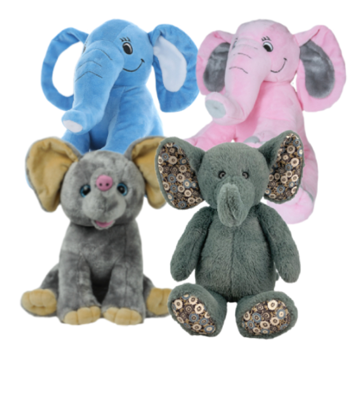 Elephant Four Pack 16 inch do it yourself stuffable animal kit requires NO SEWING! The closure on the back of each animal is velcro, and it is easy to do and hidden once closed. A great activity for a birthday party, a special family time activity or school fundraisers.